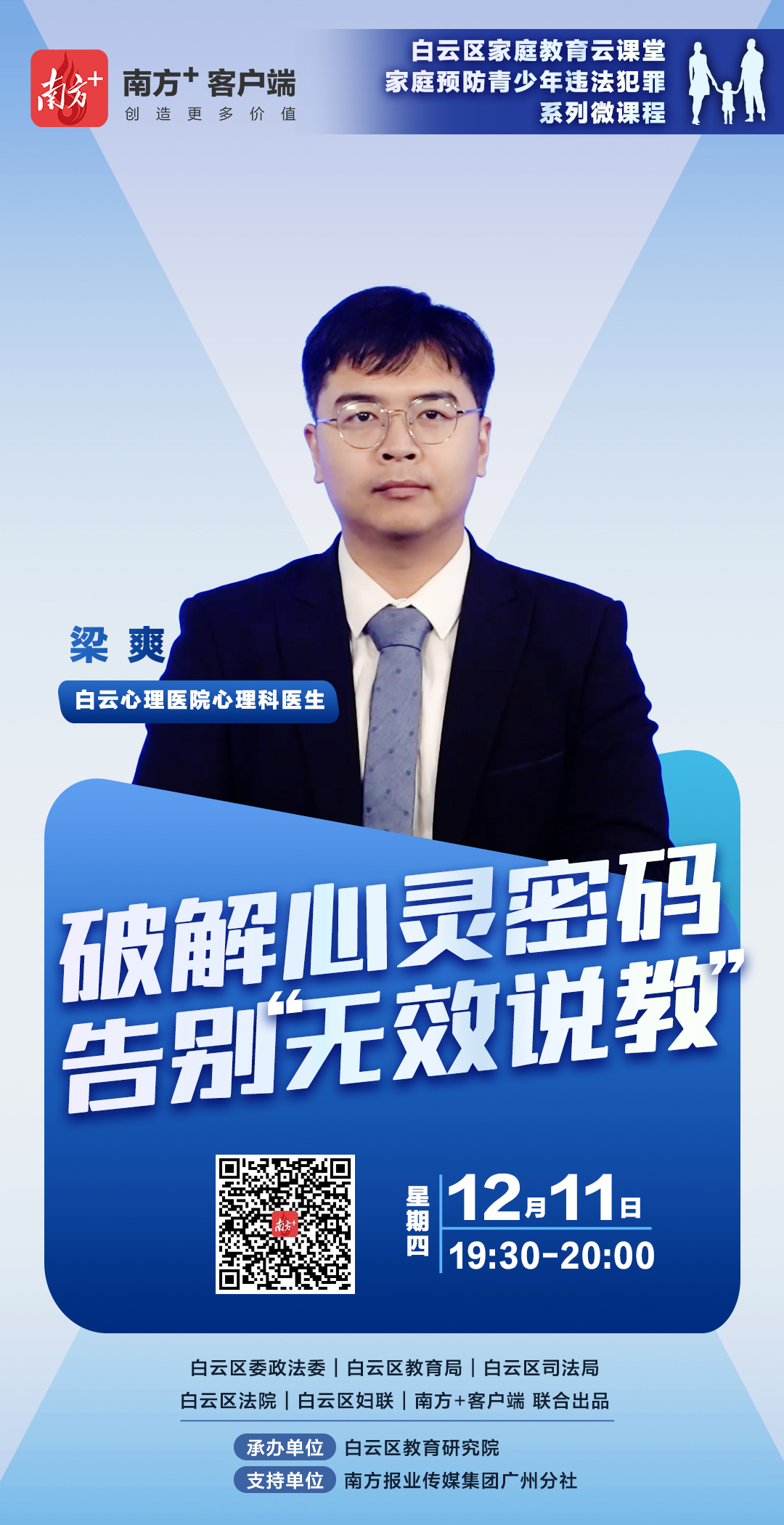 为筑牢家庭教育防线、护航青少年健康成长西安股票配资平台,白云区委政法委、白云区教育局、白云区司法局、白云区法院、白云区妇联携手南方报业传媒集团广州分社策划《白云区家庭教育云课堂——家庭预防青少年违法犯罪系列微课程》,第七期云课堂主题为《青少年心理发展与行为模式》。